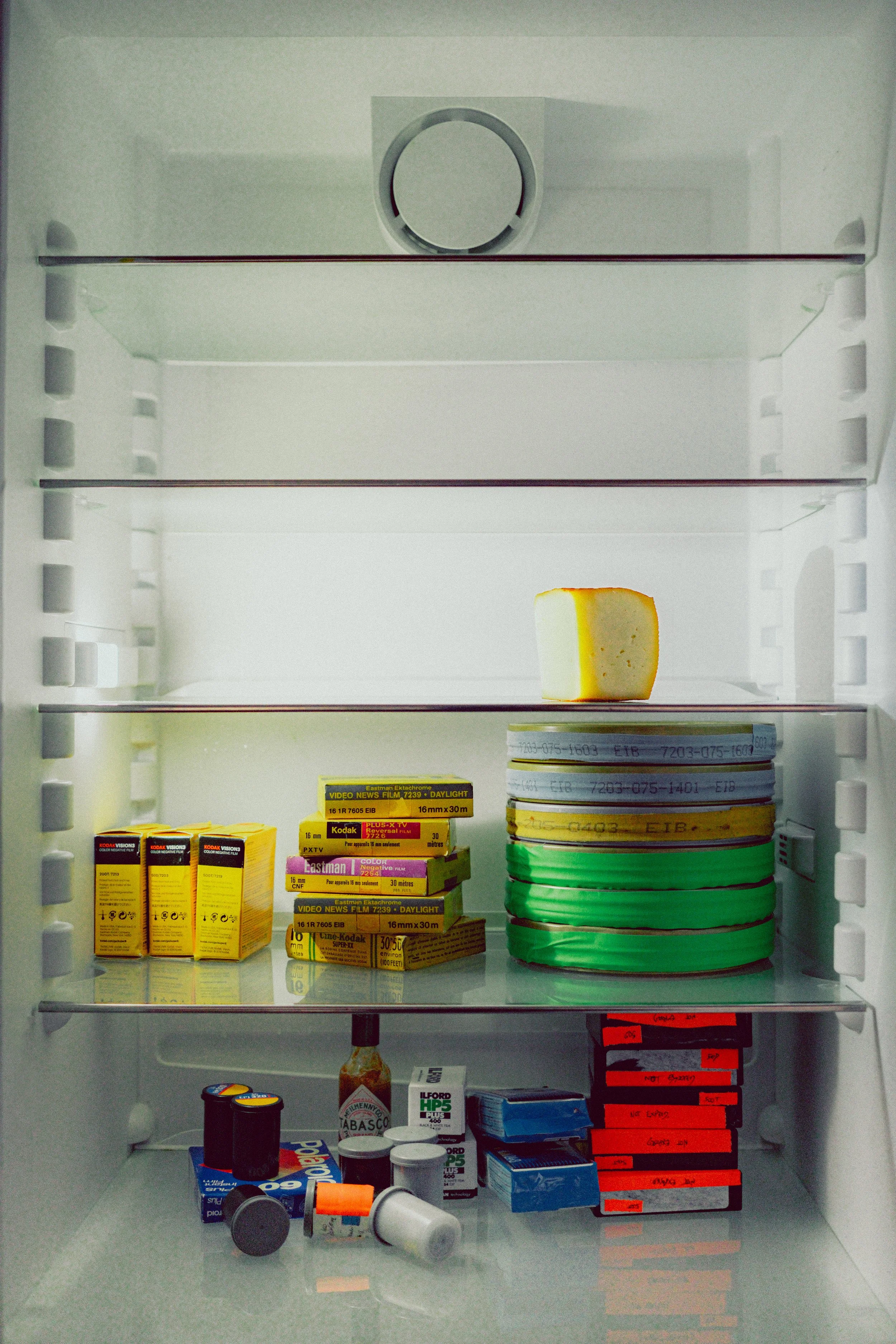 Two professional video cameras on a wooden bench, with a third camera placed on the floor below the bench, in an industrial setting.